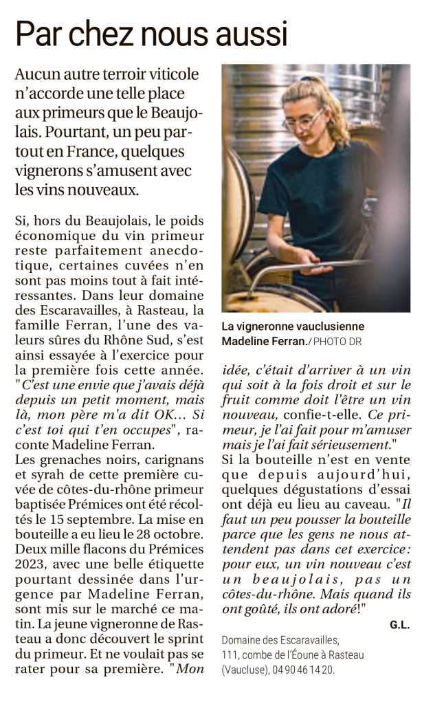 Although outside the Beaujolais region, the economic importance of vin primeur remains anecdotal, some vintages are nonetheless extremely interesting. At their Domaine des Escaravailles, in Rasteau, the Ferran family, one of the established names in the Southern Rhône, tried their hand at this exercise for the first time this year. “It’s something I’ve wanted to do for a while, but now my father has said OK… If you take care of it”, says Madeline Ferran.